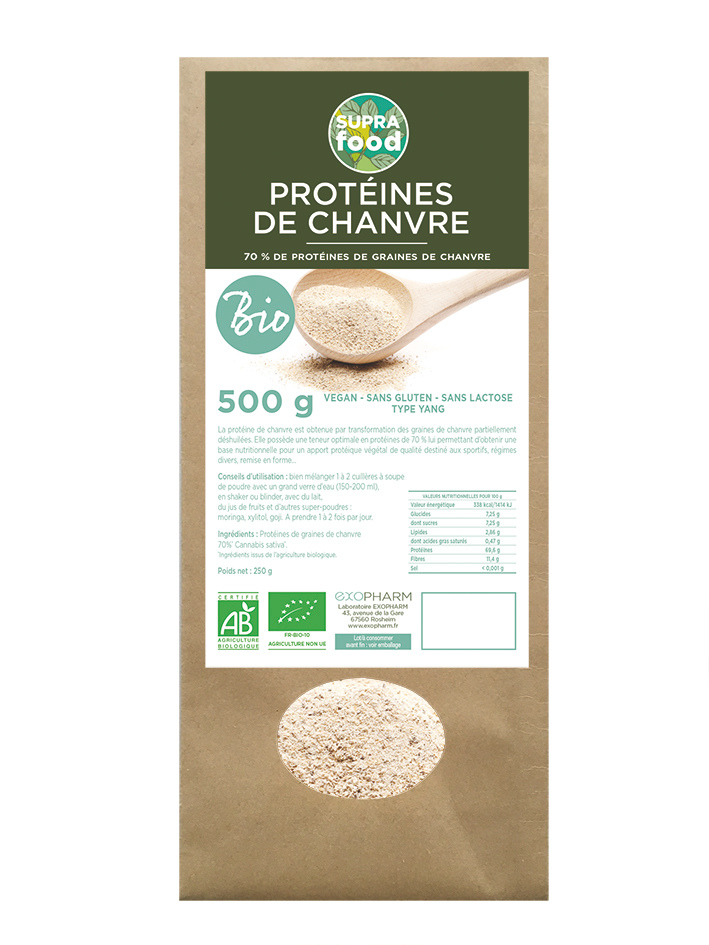 Les protéines de chanvre sont obtenues à partir de graines de chanvre biologiques partiellement déshuilées puis finement moulues afin de conserver leurs qualités nutritionnelles naturelles.